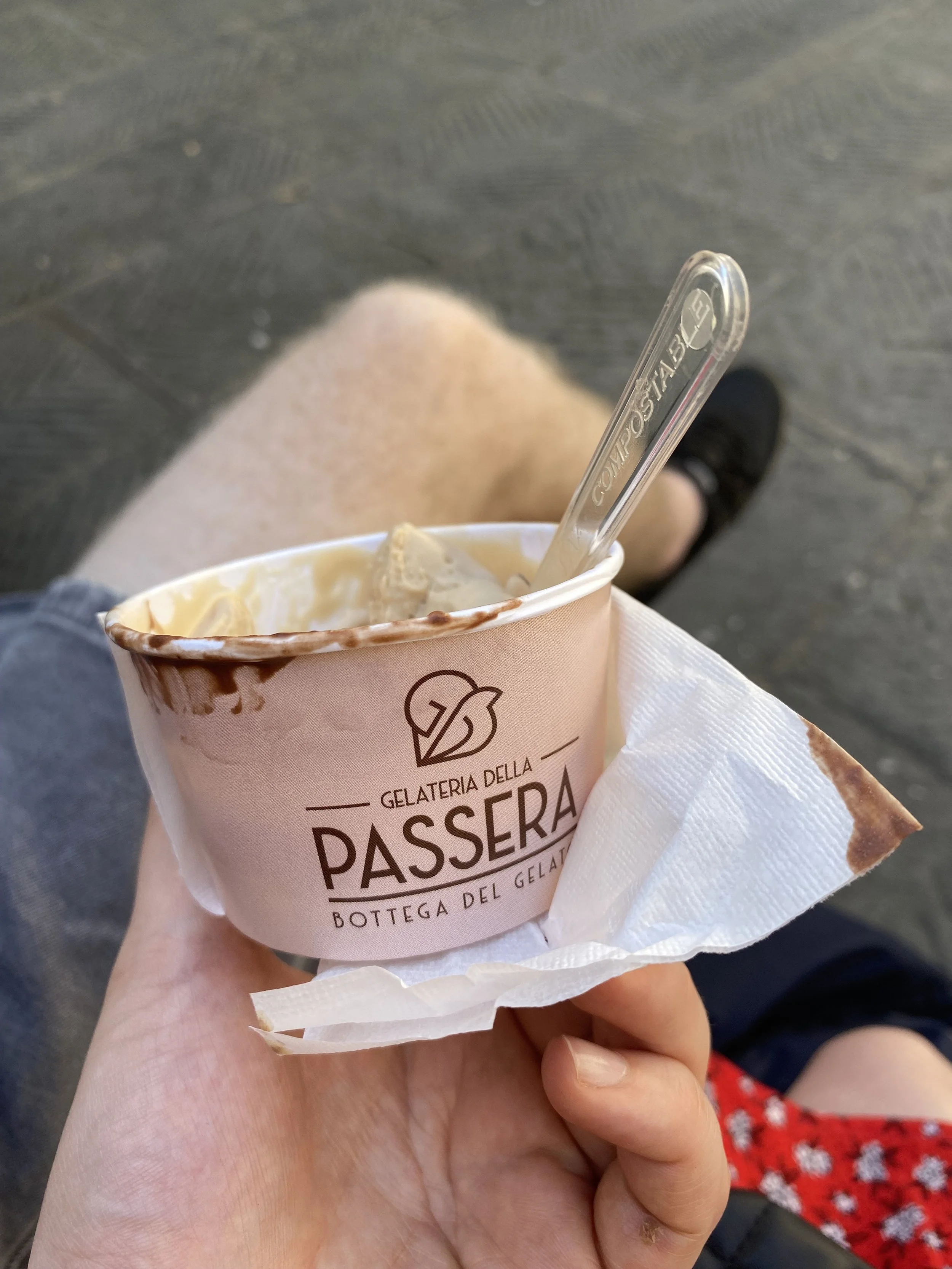 We then treated ourselves to gelato (ice cream) and discovered a really good ice cream parlour called Gelateria Della Passera.We both had two scoops of hazelnut and chocolate orange, both amazing!