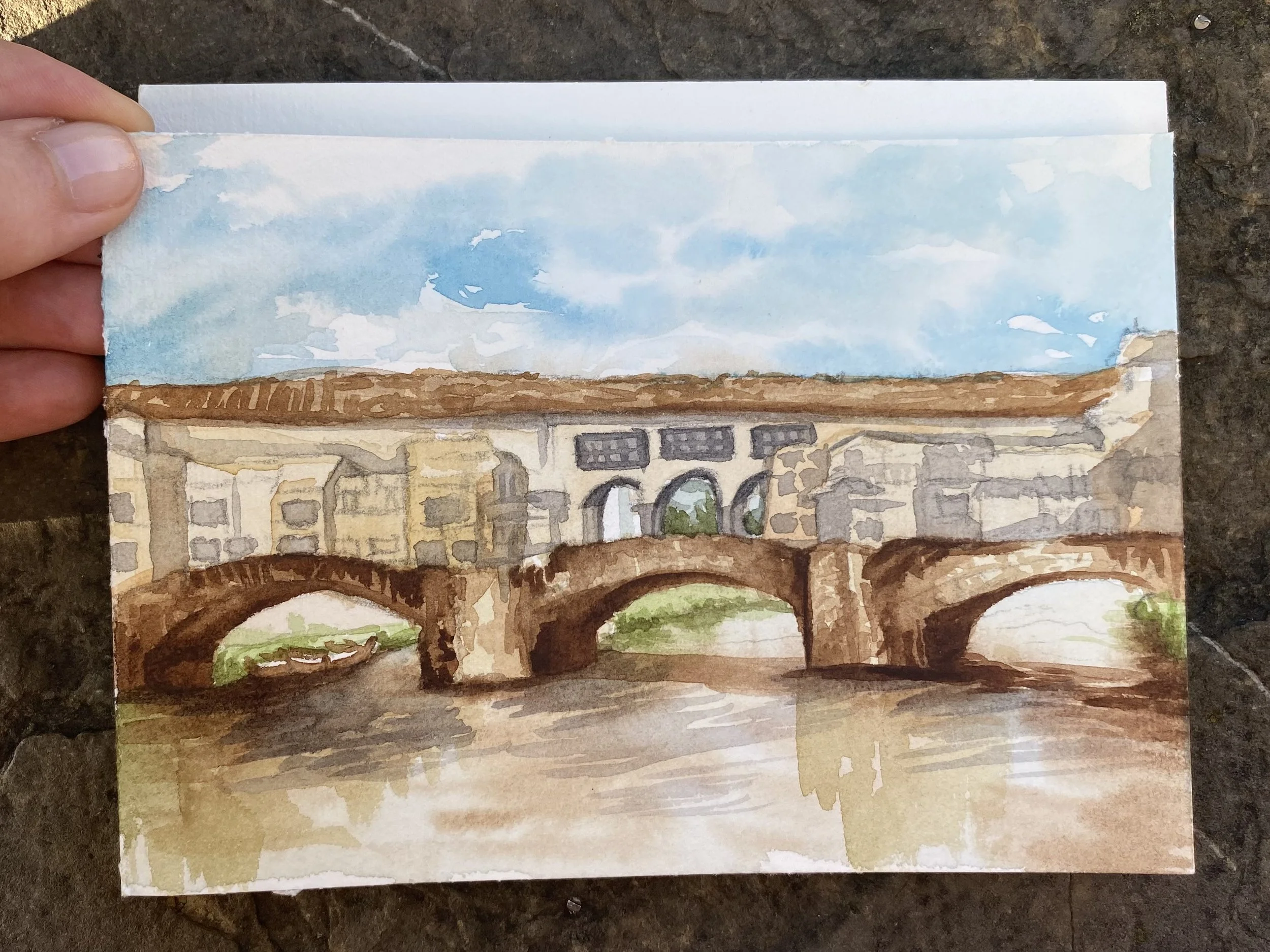 On our last day, Joe and I decided to take it easy due. I decided that I wanted to paint the Ponte Vecchio Bridge (built in 123AD). It is the oldest bridge in Florence and the only bridge that survived the devastation of WW2. This bridge inspires me because of it’s great history and I see it as a symbol of strength. Thankfully, I came prepared with my travel watercolours.